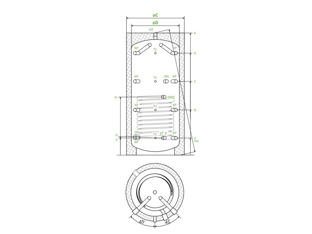 Nádrž slúži ako zásobník tepla – ukladá teplú vodu z hlavného zdroja tepla (kotol, tepelné čerpadlo) a zároveň umožňuje pripojenie solárneho systému cez výmenník. Solárne kolektory ohrievajú nemrznúcu kvapalinu, ktorá cirkuluje cez výmenník, a tým sa teplo prenáša do vody v nádrži. Vďaka tomu máte zabezpečený energeticky úsporný ohrev teplej vody a možnosť využívať obnoviteľné zdroje.